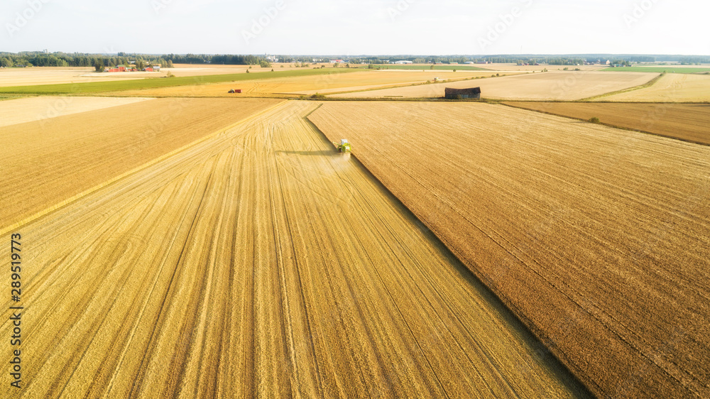Aerial view Combine Harvester gathers the wheat at sunset. Harvesting grain field, crop season. Beautiful natural aerial landscape. Food industry concept.