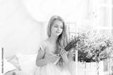 Rustic style bedroom, provence style. Childhood concept. Cute little girl in a dress holds a bouquet of lavender in her hands. A child sits on a bed in his nursery against a background of daisies.