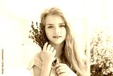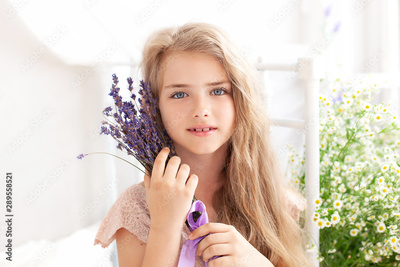 Provence. A close-up portrait of a pensive blonde little girl holding a fragrant bouquet of lavender by her face. The concept of childhood and beauty. Aromatherapy. Wildflowers, allergies. Summer