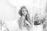 Provence. Cute blond little girl holding a fragrant bouquet of lavender by her face. The concept of childhood and beauty. Aromatherapy Portrait of a girl on the bed in a bright bedroom in the morning.
