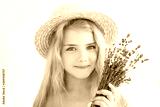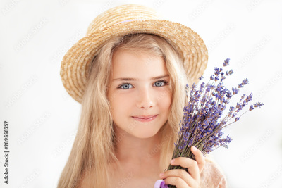 Closeup romantic portrait Charming little blond girl in a straw hat holds a bouquet of lavender. Summer flowers, aromatherapy. An allergy. Childhood concept. Girl holds a bouquet of lavender. provence
