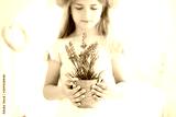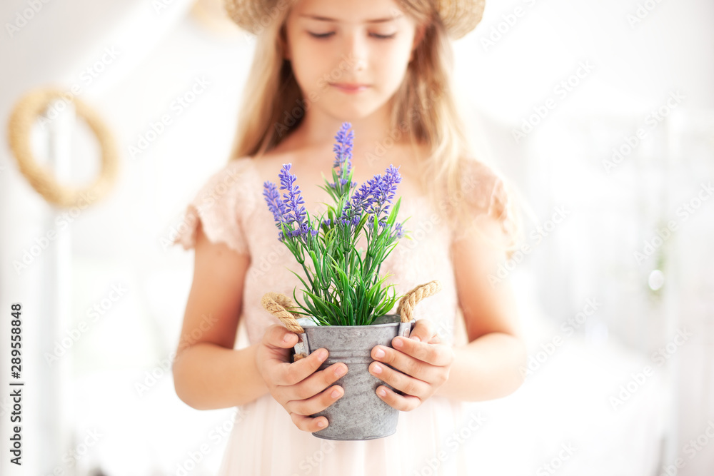 Cute little girl with long blond hair in a straw hat in a dress holds pot of lavender. Childhood concept. Gardening. floriculture. Environmental Protection. Hobby. Summer flowers, houseplant lavender