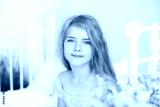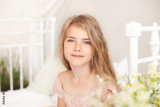 Close-up portrait of a cute little girl. A thoughtful little blonde girl with long hair sits on a bed in a bright white bedroom with a rustic interior. Childhood concept. Cute girl is dreaming.