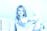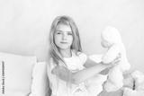 Childhood concept. Little girl with blond long hair playing in bed in a white bedroom. Toddler with a toy. happy girl playing with toys and dreaming in kindergarten. Close up portrait of a happy baby.