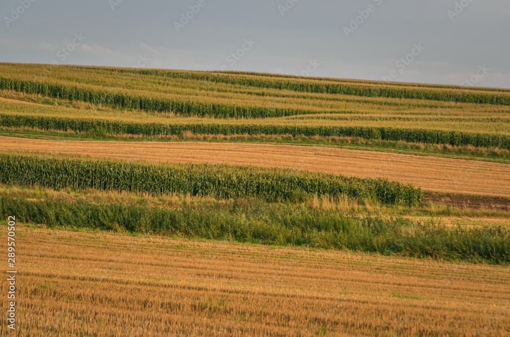 Beautiful summer afternoon landscape. Golden illuminated farmland in the countryside.