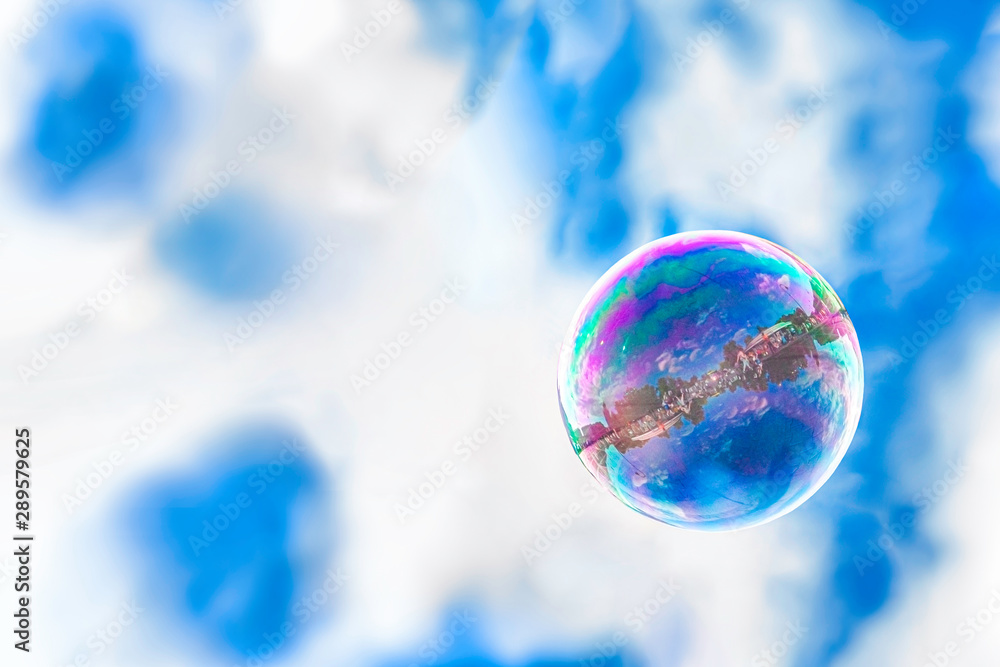 air soap bubble against the sky, the reflection of the city in the sphere, the concept of clean air in the big city, environmental protection