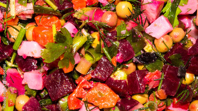 Vinaigrette of different vegetables with peas.Background of the vinaigrette.