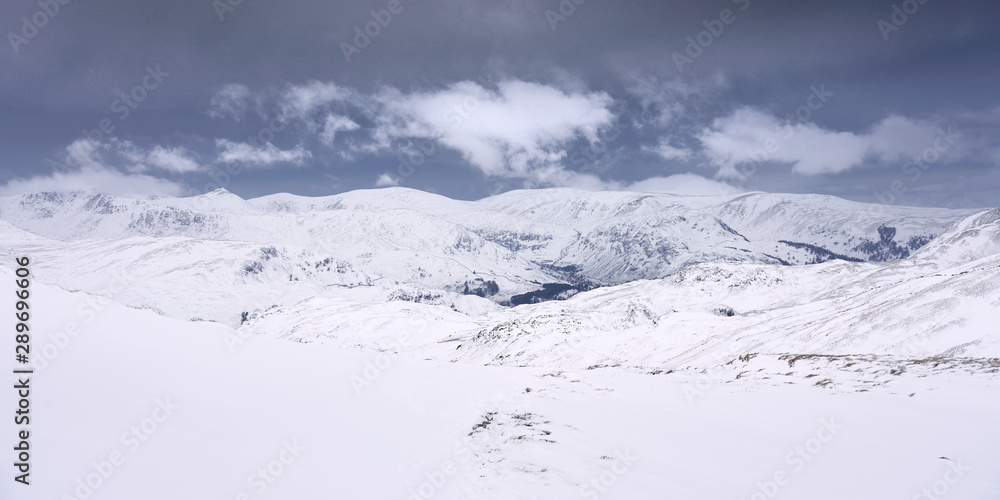 A winter snowy Lake District scene of the summits of Helvelly, Watson Dodd, Great Dodd and Matterdale Common from Rampsgill Head near Hartsop.