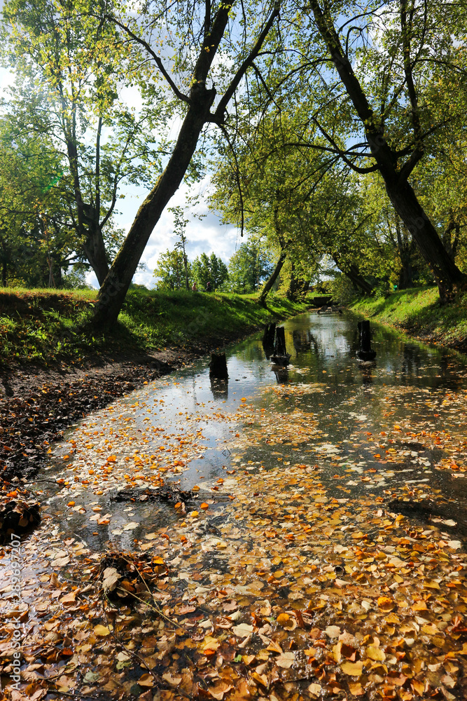 Romantic park view with canal covered by autumn fallen yellow leaves