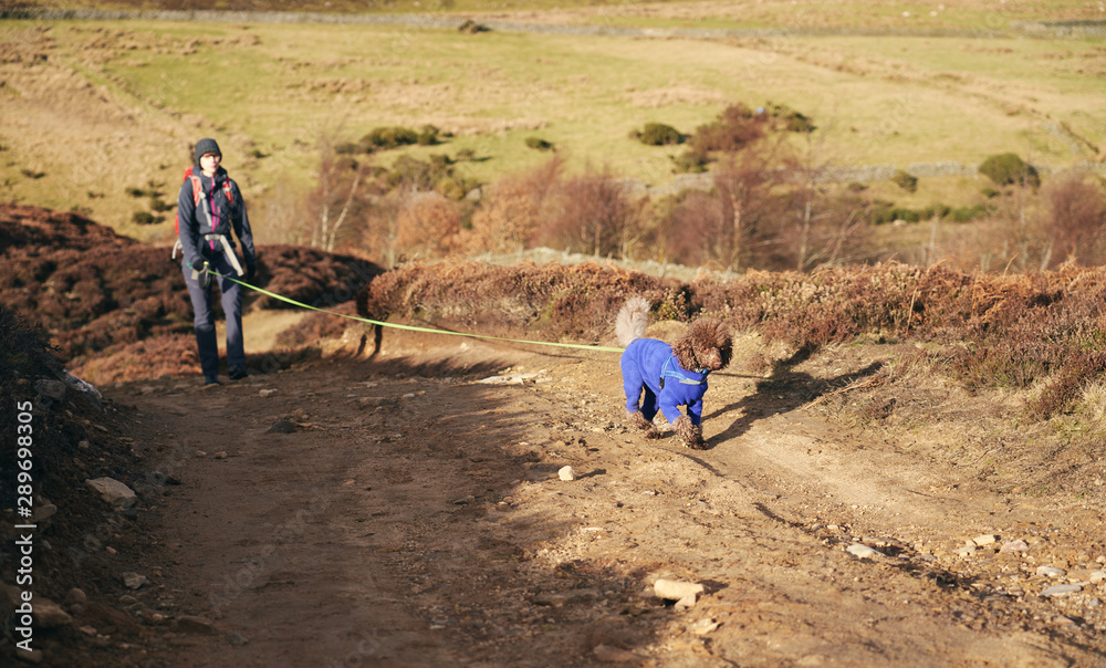 A female hiker out for a dog walk across the moors at Edmundbyers.