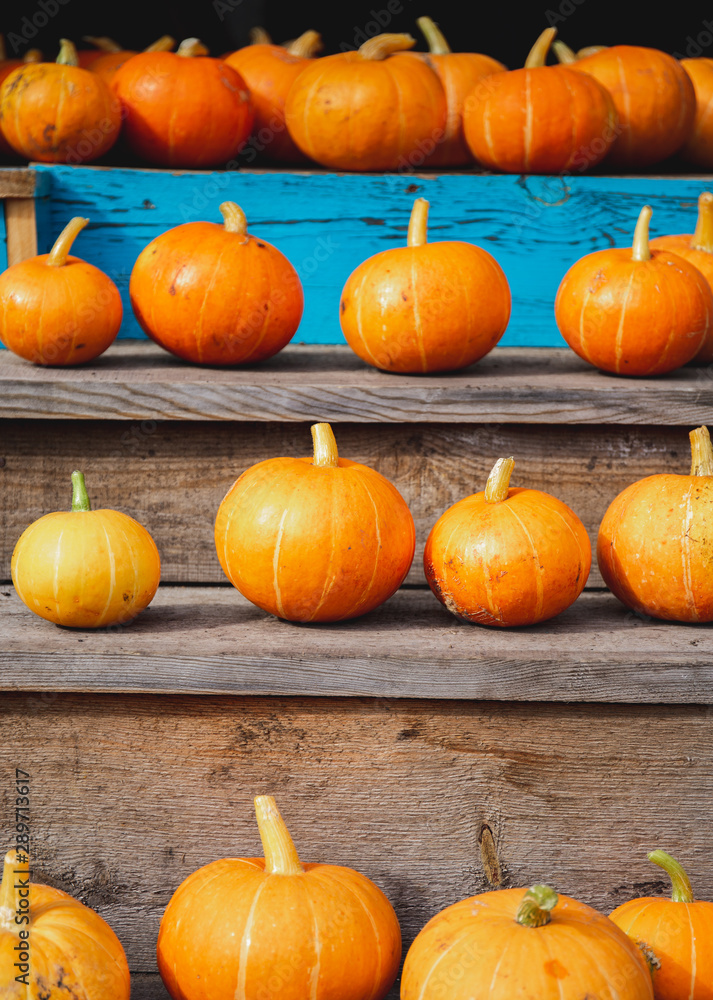 Autumn harvest halloween concept. Fall pumpkins, Copy space