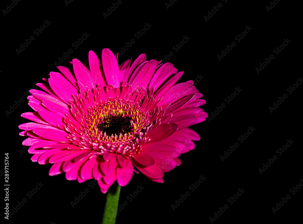Kwiat na czarnym tle. Fioletowa gerbera. Wyizolowane z tla. Ciete kwiaty. Rosliny z domowego ogrodu.