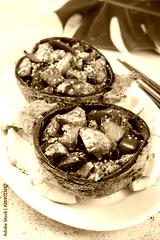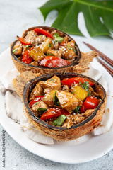 Hawaiian pinapple chicken in natural coconut shell plates on white background