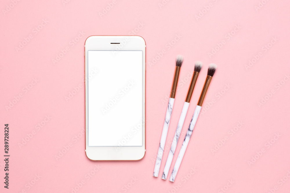 Mobile phone and beauty make up brushes on a pink background
