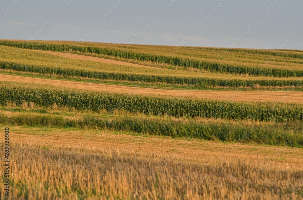 Beautiful summer afternoon landscape. Golden illuminated farmland in the countryside.