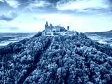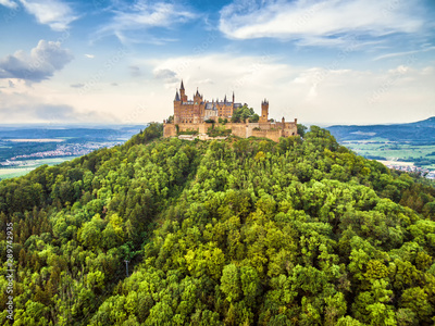 Hohenzollern Castle on mountain top, Germany. This fairytale castle is famous landmark in Stuttgart vicinity. Aerial view of Burg Hohenzollern in summer. Landscape of Swabian Alps with Gothic castle.