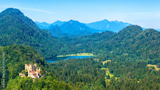 Landscape with Hohenschwangau Castle, Bavaria, Germany. Beautiful panorama of Schwansee lake in mountains. Scenery of Alpine nature in summer. Aerial scenic view of famous German castle in Alps.