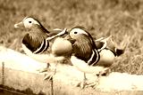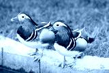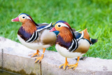Ducks standing by pond. Two mandarin ducks on green grass. Waterfowl birds close-up. Beautiful colorful ducks outdoor in summer.