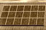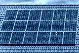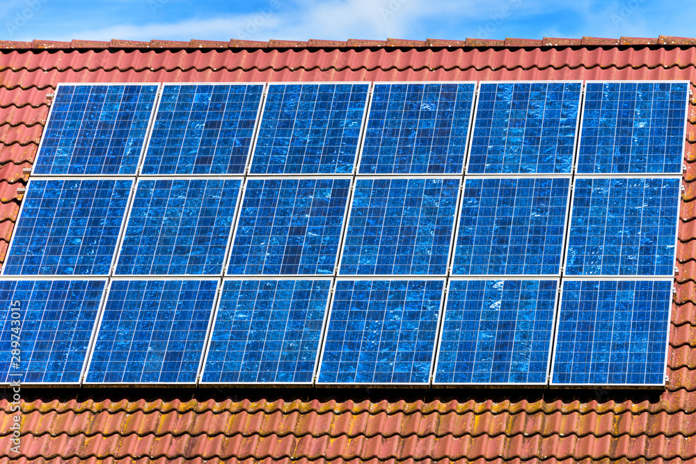 Solar panel on residential house rooftop. Solar system on roof of home close-up. Blue solar cells on building top for alternative energy. Photovoltaic eco panels for electricity from clean sun power.