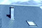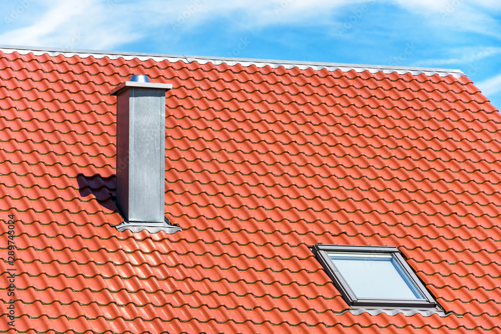 Chimney and window on clean roof of residential house. Steel home chimney close-up in summer. Modern air vent system on rooftop. Metal chimney pipe on background of red tiles and blue sky.
