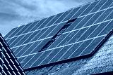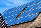 Solar panel on residential house rooftop. Solar system on roof of home close-up. Blue solar cells on building top for alternative energy. Photovoltaic eco panels for electricity from clean sun power.