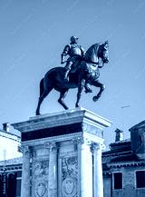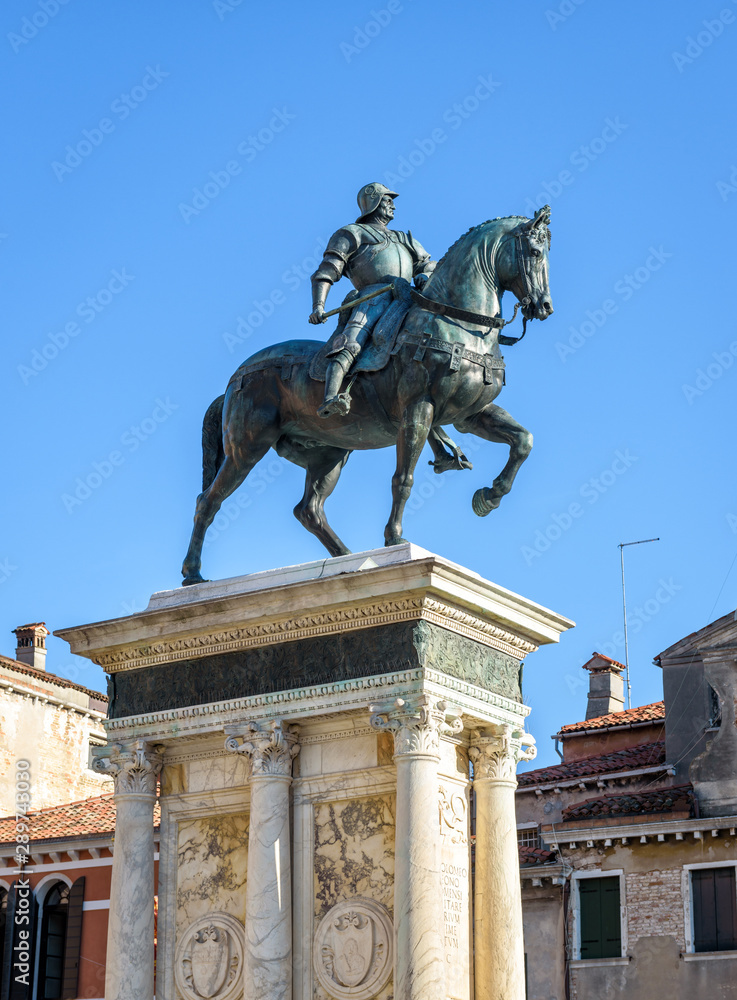 Statue of Bartolomeo Colleoni of 15th century, Venice, Italy. Old monument, bronze sculpture of the Renaissance. Equestrian statue of famous commander of Venice city in summer. Medieval art of Venice.