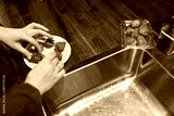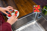 Woman arranging red juicy Japanese strawberries on plate from plastic container box by stainless steel sink in kitchen room with wooden table counter