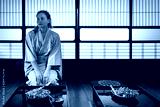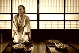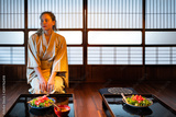 Young woman in kimono seiza sitting in traditional Japanese house or ryokan restaurant room by table with salad plates, shoji sliding paper doors in background