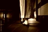 Traditional Japanese home or ryoka with tatami mat floor, shoji sliding paper doors, back of woman feet in kimono and geta shoes tabi socks walking in corridor hall room