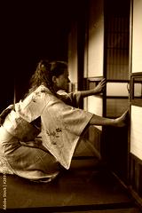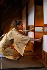 Traditional japanese house or ryokan with tatami mat floor and gaijin woman in kimono and tabi socks opening shoji sliding paper doors