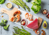Healthy Clean eating concept. Vegetables, seafood, oil, Food background with copy space