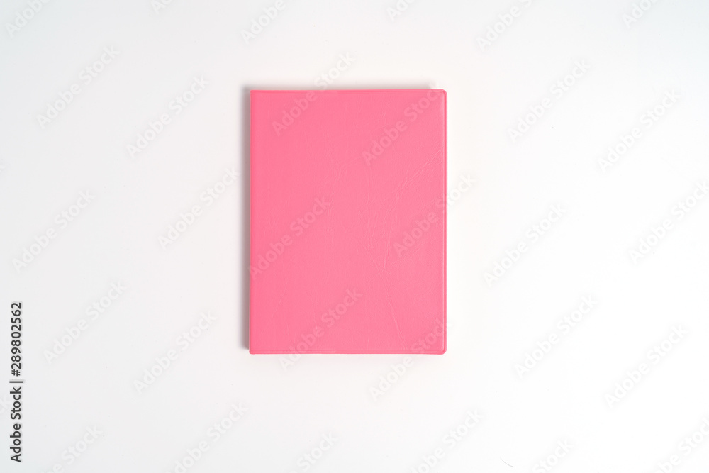 Pink notebook on white desk. Business minimal concept for women. Flat lay, top view, copy space