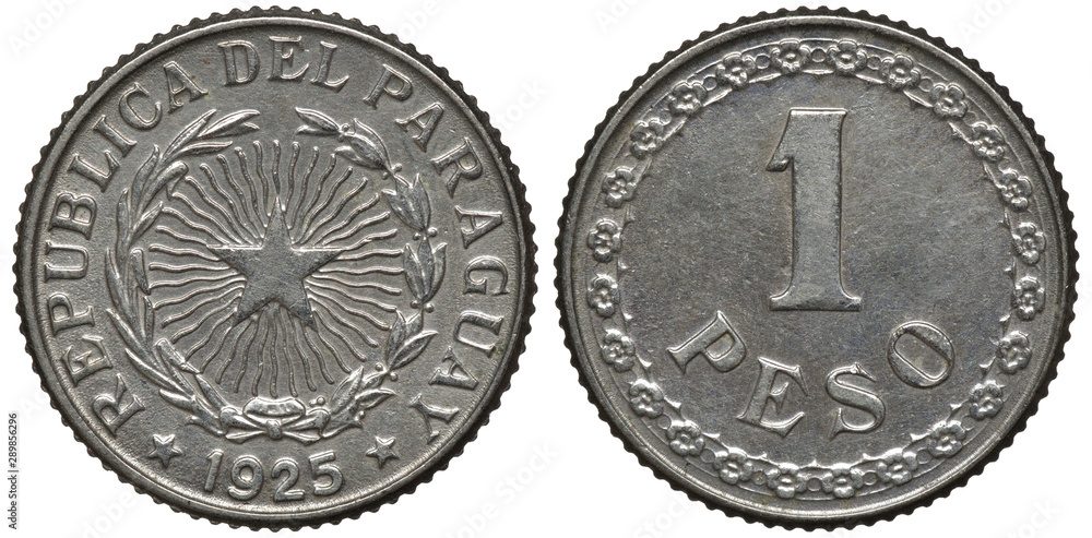 Paraguay Paraguayan coin 1 one peso 1925, radiant star within wreath, date below, denomination within flower circle,