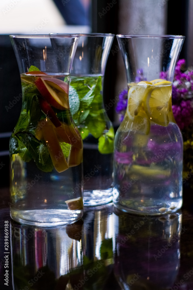 Useful and beautiful water with mint and fruit in glass pitcher. Glasses. Detox. Natural lemonade.