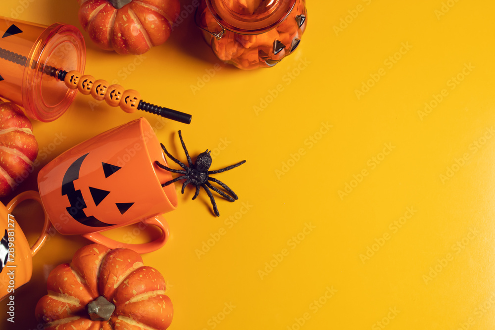 horror spooky funny ghost in halloween pumpkin holiday season greeting night celebration party with toy prop decoration in top view flatlay and trick or treat festival concept