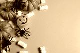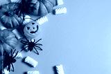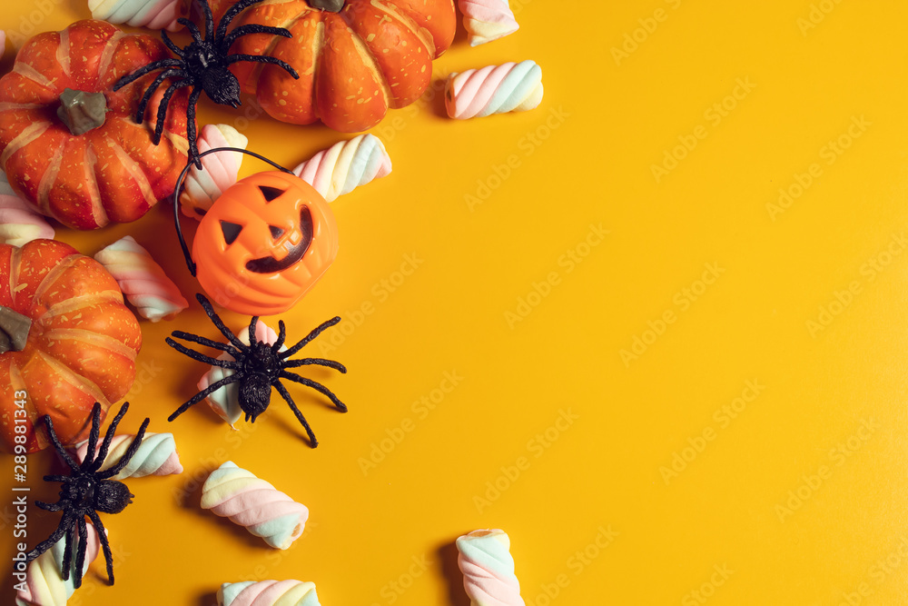 horror spooky funny ghost in halloween pumpkin holiday season greeting night celebration party with toy prop decoration in top view flatlay and trick or treat festival concept