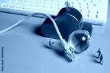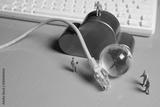 keyboard computer, lan server internet wire and cloud storage device and human engineer toy in top view workspace table, digital data security privacy network for business concept