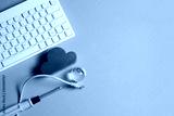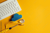 keyboard computer, screwdriver with lan server internet wire and cloud storage device with globe in top view flat lay workspace table, digital data security privacy network for business concept