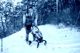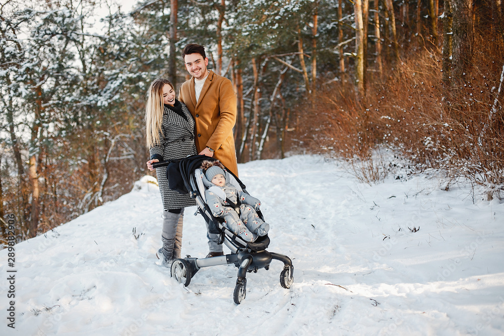 happy young couple pushing a stroller in the park on a snowy winter day