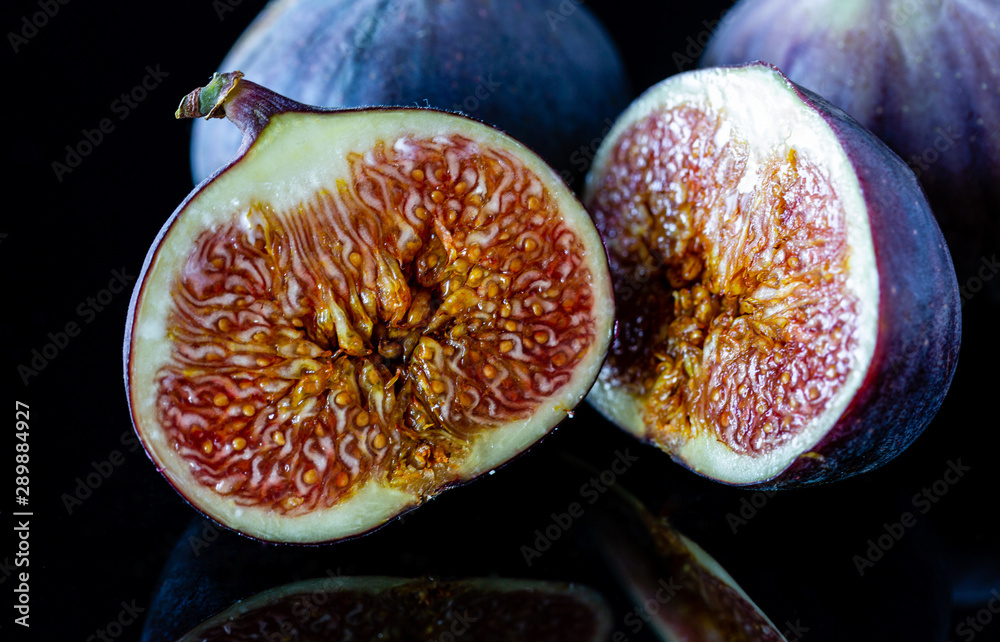 Dojrzale i swieze figi. Przkrojona figa. Figa na czarnym tle. Smaczny owoc na deser.