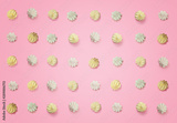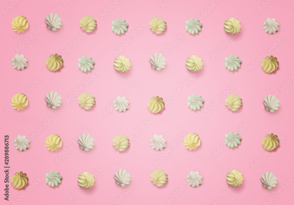 Decoration made of white and yellow meringue. Top view. Pink pastel background.