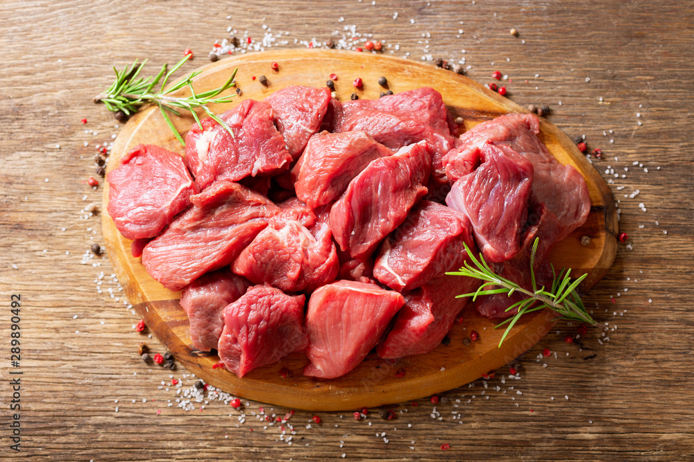 fresh chopped meat with rosemary on wooden board