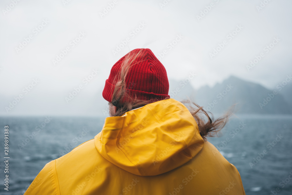 Alone traveler wearing yellow raincoat and red hat looking at stormy sea and foggy mountain. Lifestyle outdoor adventure, scandinavian wanderlust