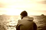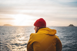 Alone man traveling on ship and looking at sunset sea and foggy mountain on skyline. Hipster traveler wearing yellow raincoat and red hat enjoying beautiful ocean after storm