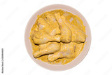 The chicken in the marinade.Background of the chicken in the marinade.Marinated chicken drumstick.
