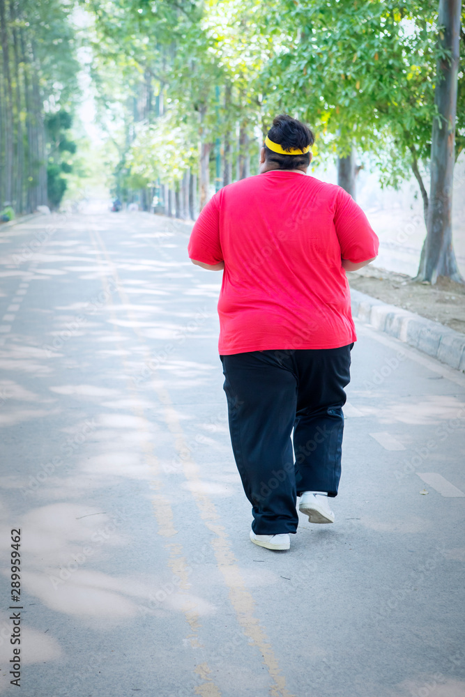 Rear view of obese man jogging on the road