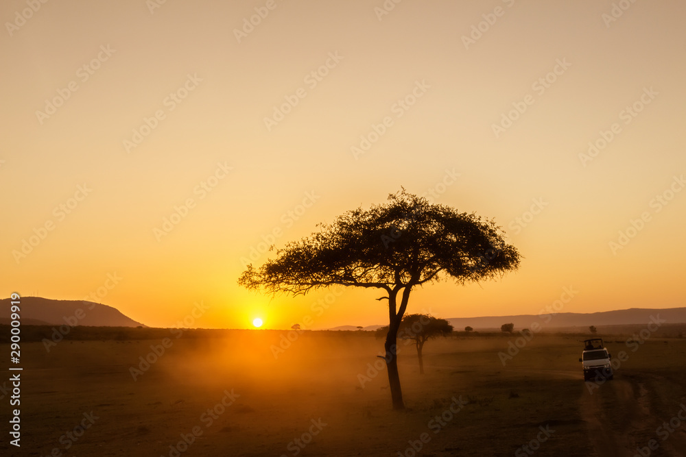 African sunrise with acacia trees and safari car in Masai Mara, Kenya. Savannah background in Africa. Safari concept