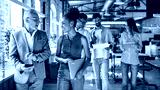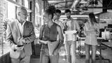 Before meeting. Two business experts discussing something while walking with colleagues through the office corridor
