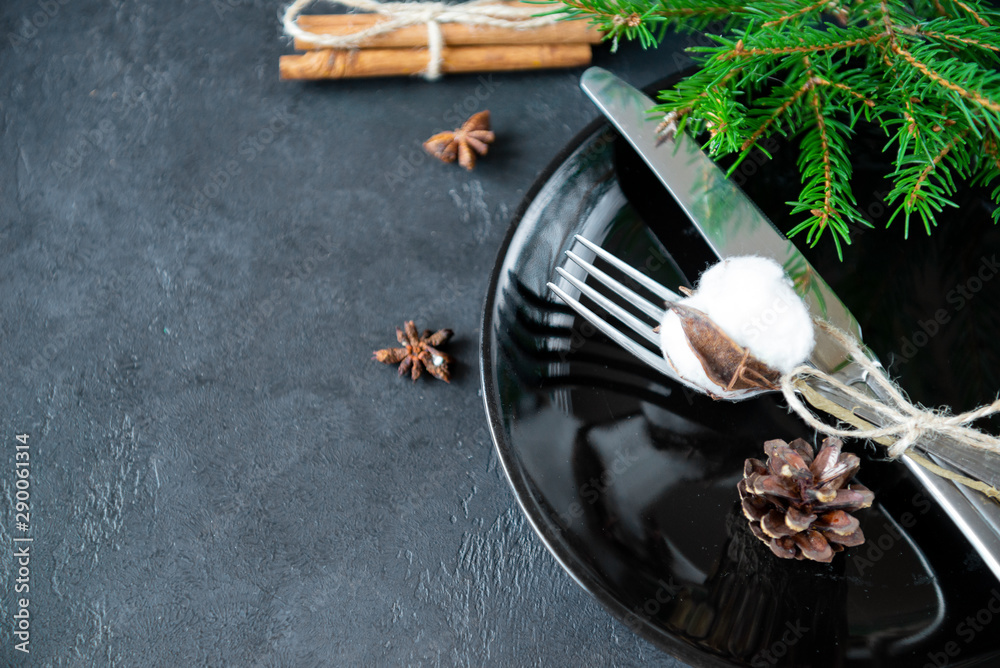 fork with knife and cotton branch on a black plate on a spruce branch on an black background, cinnamon sticks ,