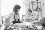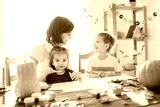 family mother and child daughter in hat witch are preparing for Halloween carve a pumpkin and decorate the house Happy Halloween concept